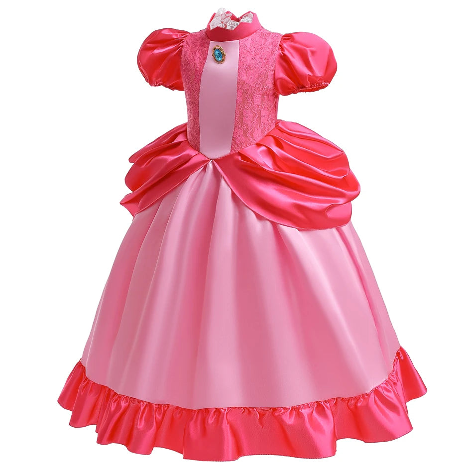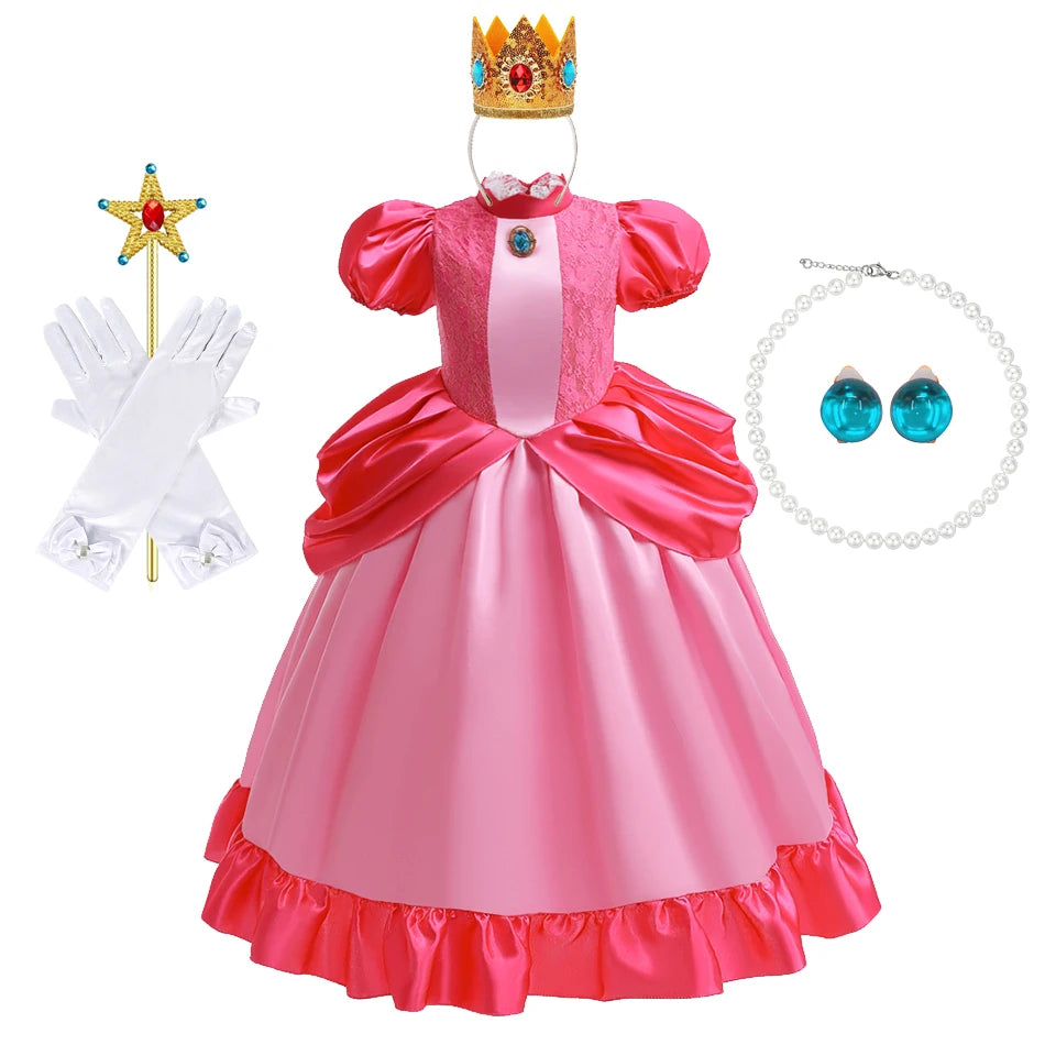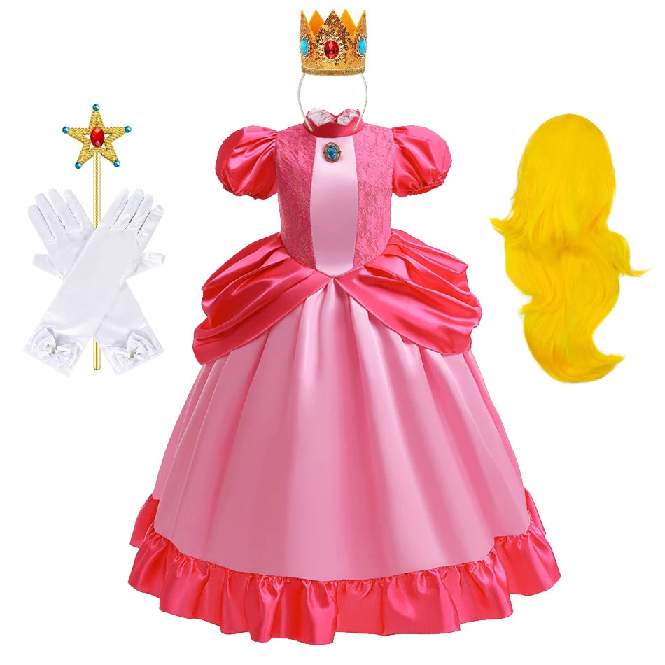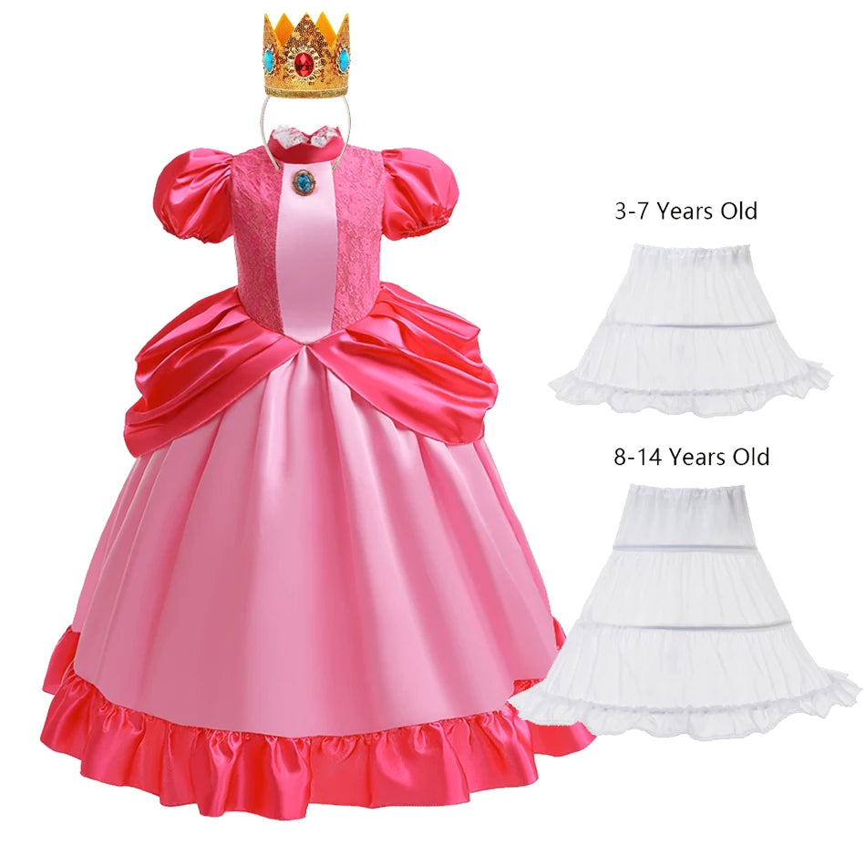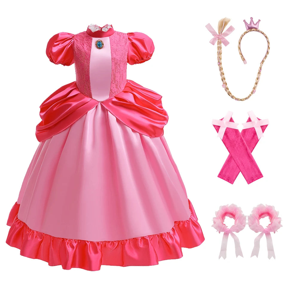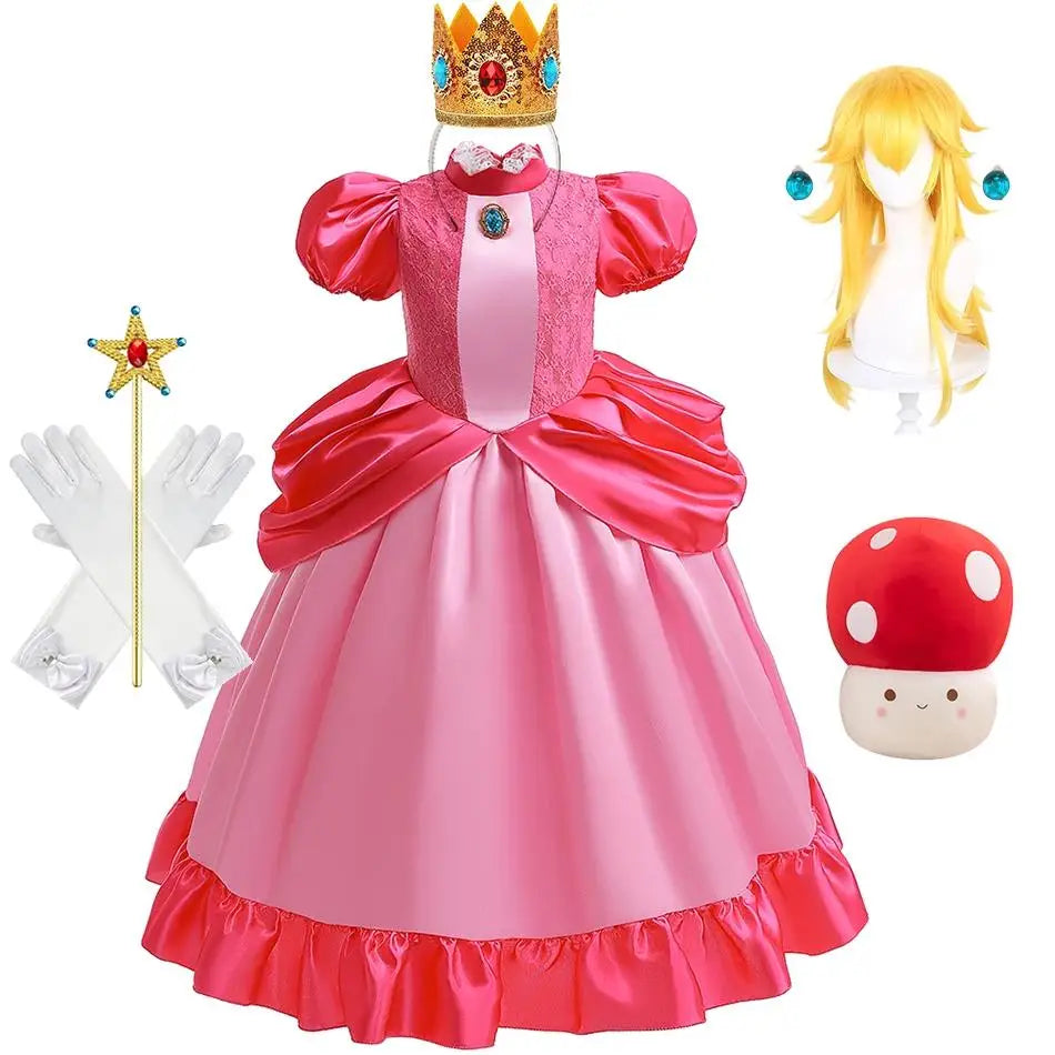 Girls Peach Princess Dress Halloween Cosplay Costume Children Cosplay Party Super Bros Plumber Clothes Birthday Party Outfits