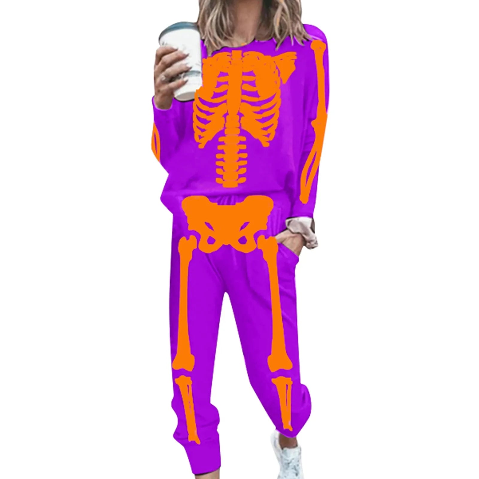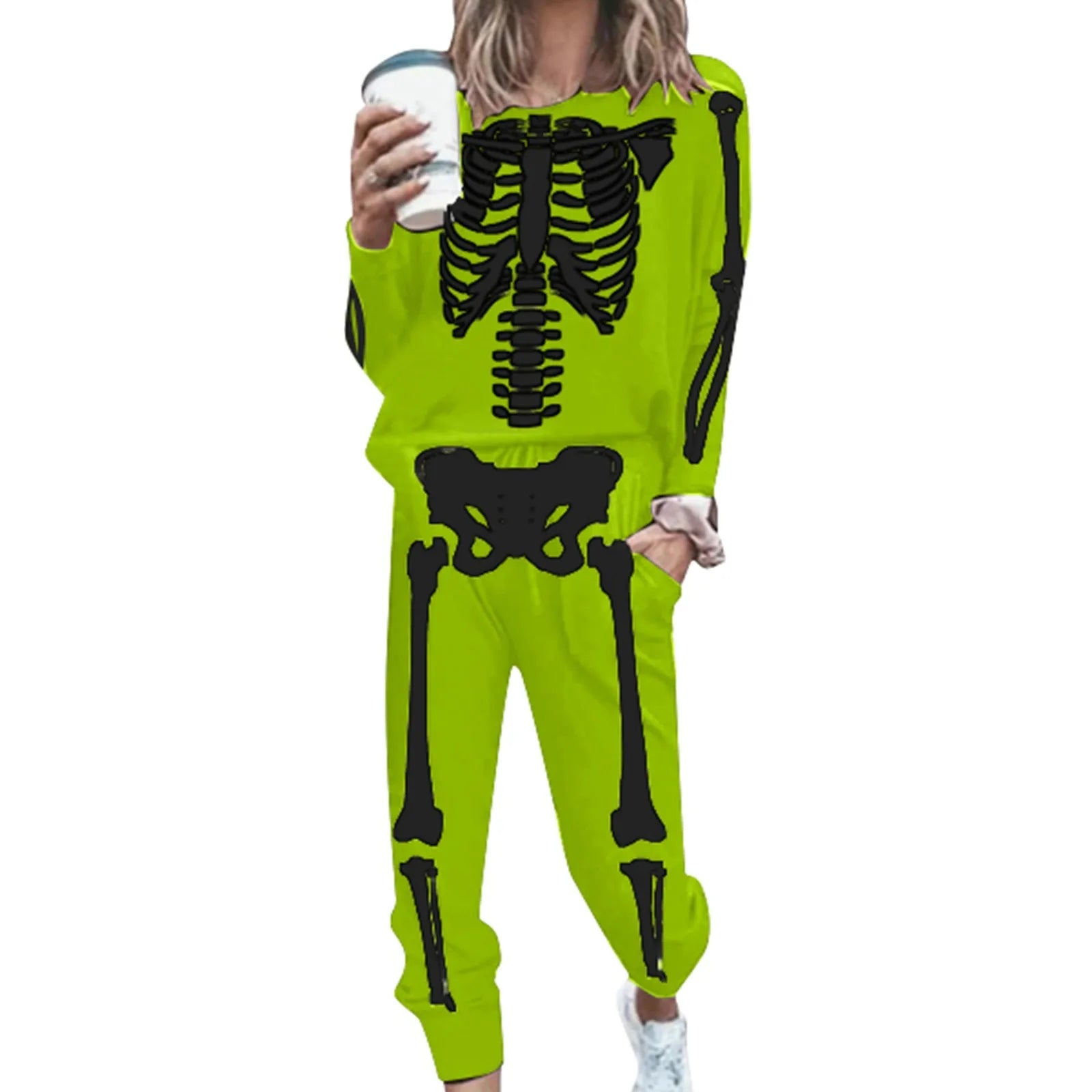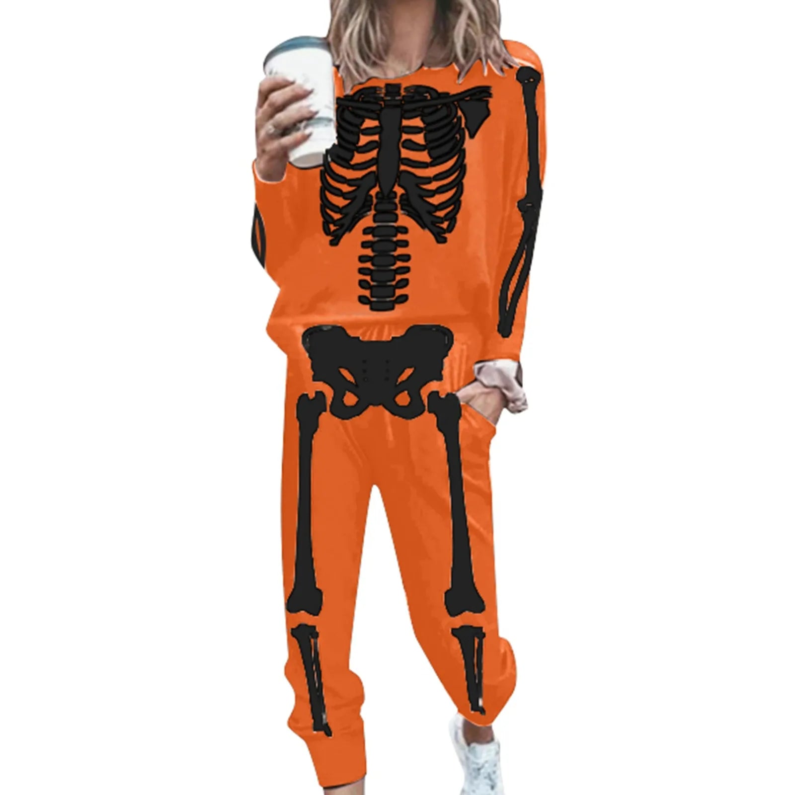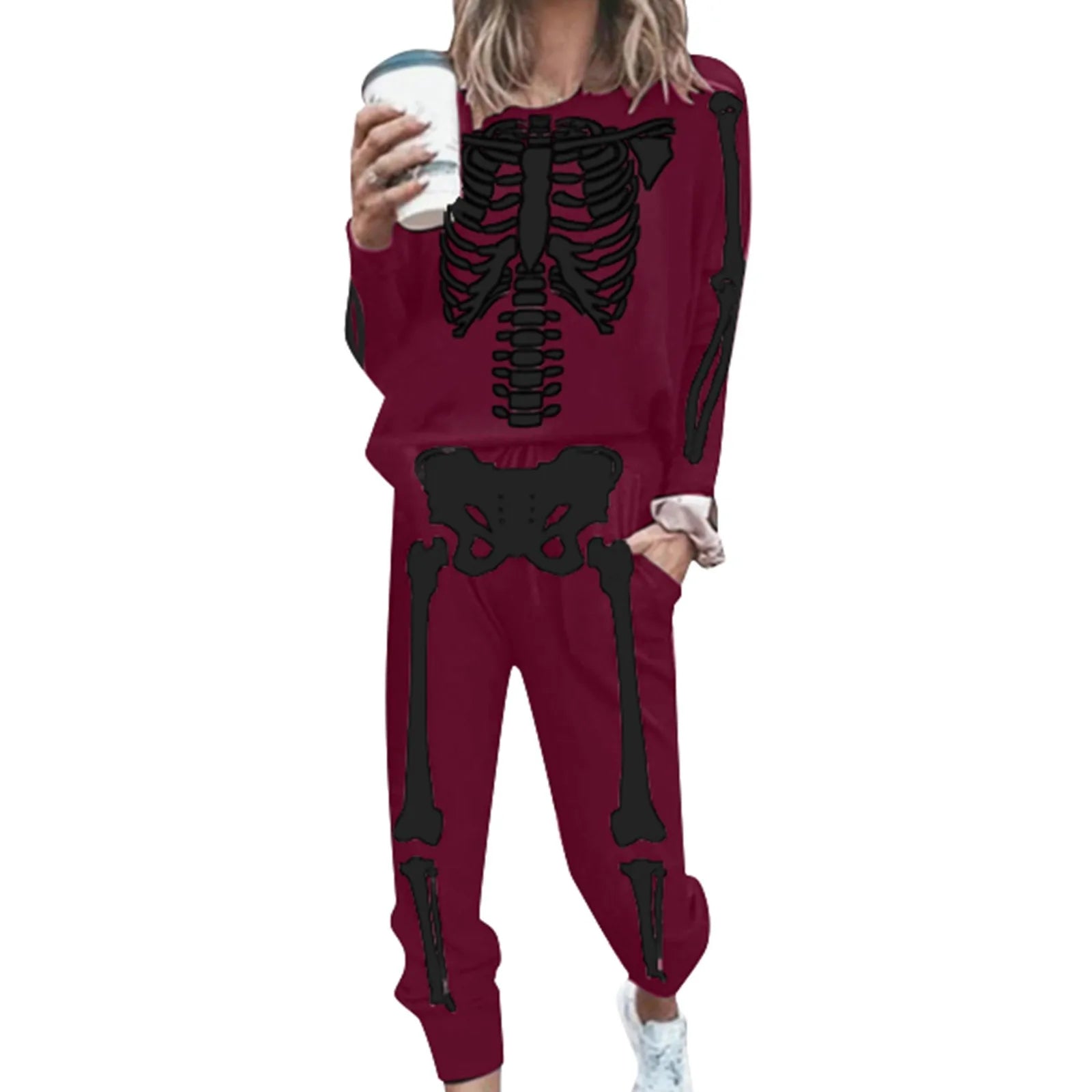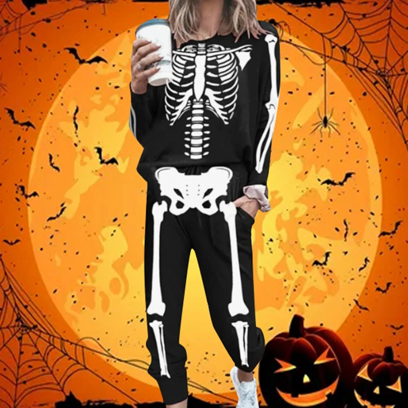 Women Tops Long Pants Suit Fashion Halloween Skeleton Print Long Sleeve T-Shirt Loose Sportswear Casual Two Piece Outfits Fall