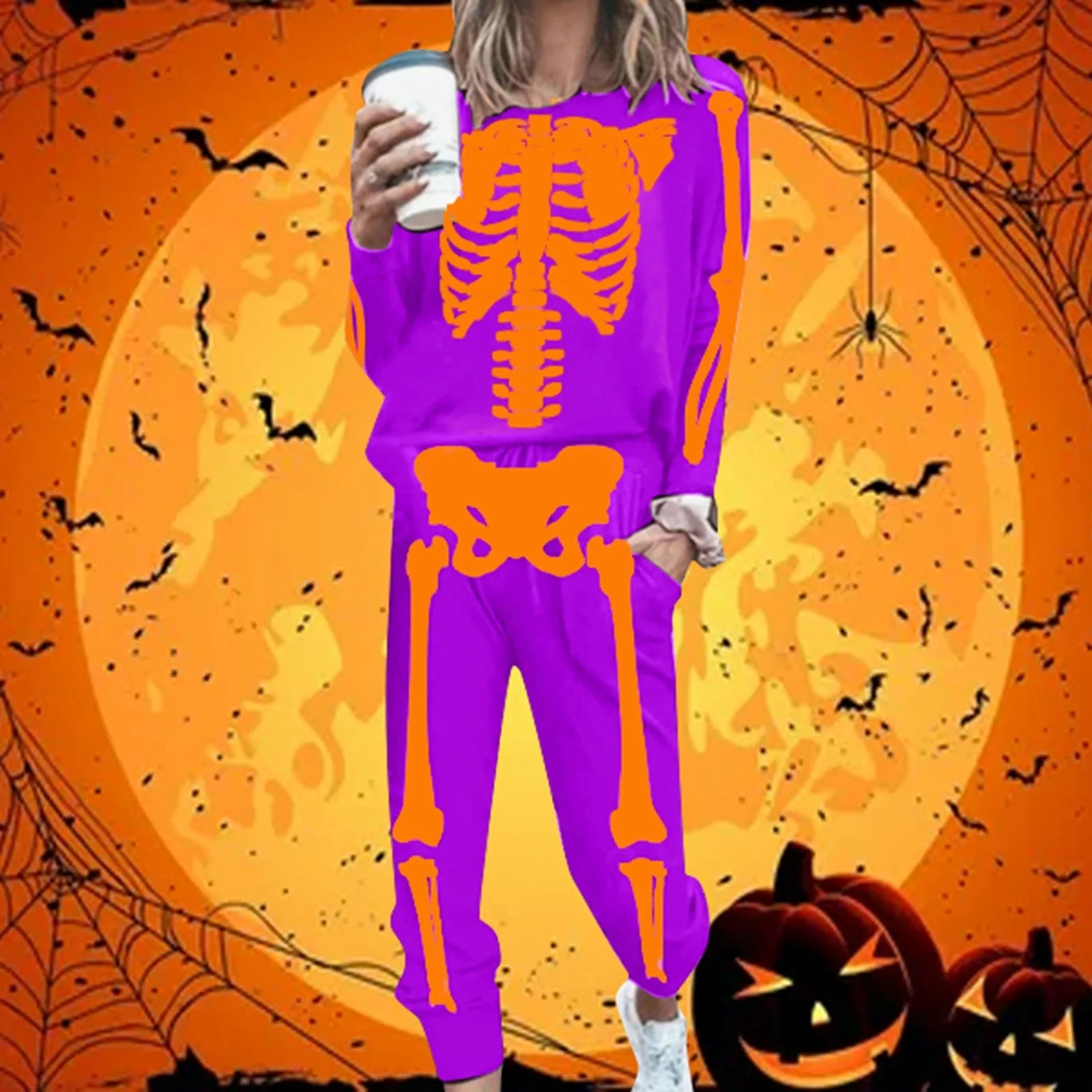 Women Tops Long Pants Suit Fashion Halloween Skeleton Print Long Sleeve T-Shirt Loose Sportswear Casual Two Piece Outfits Fall - www.sixcolors.us