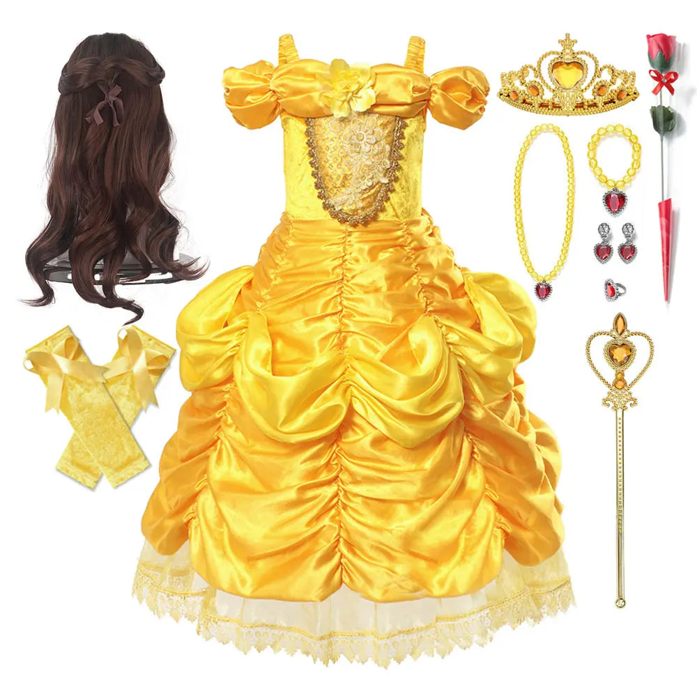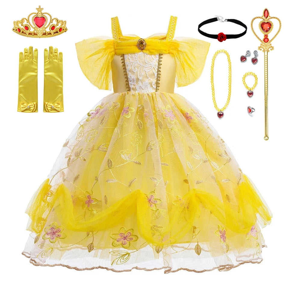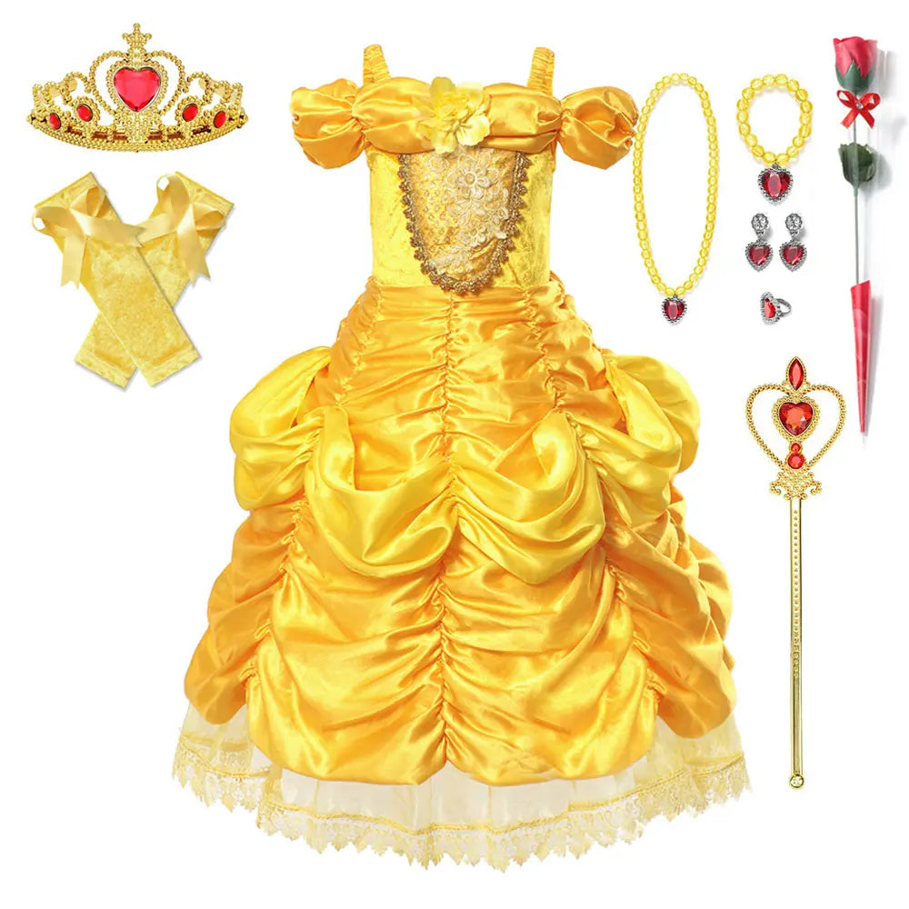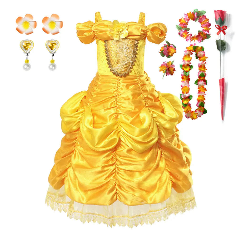 Disney Belle Princess Dress for Girl Kids Floral Ball Gown Child Cosplay Bella Beauty and The Beast Costume Halloween Party