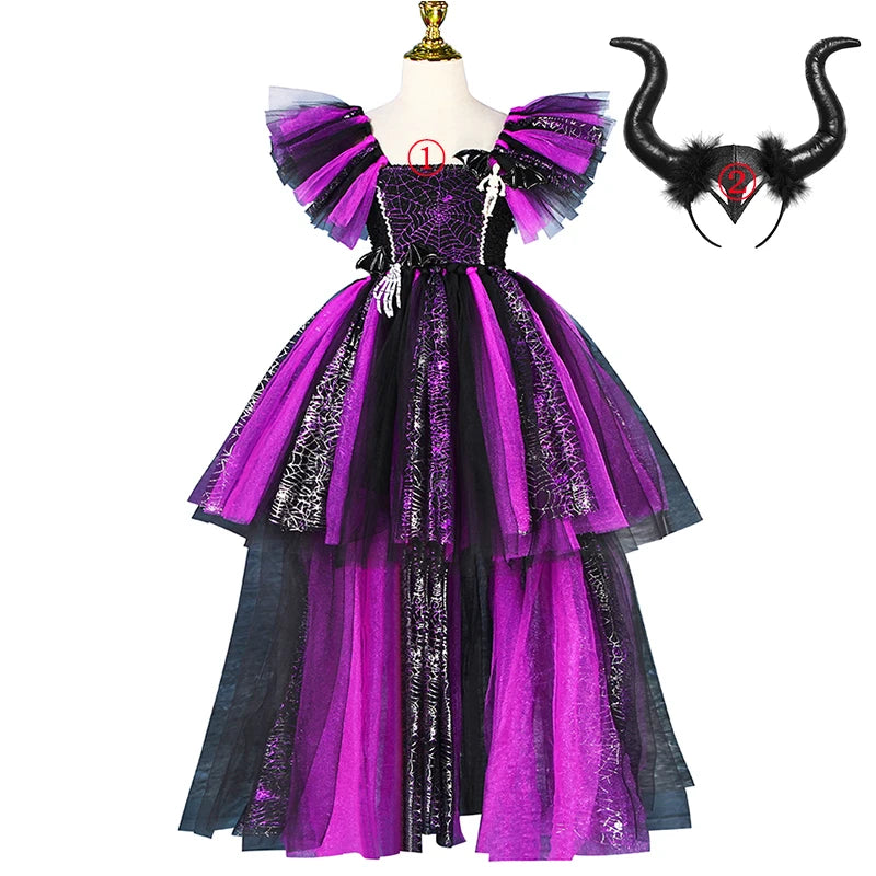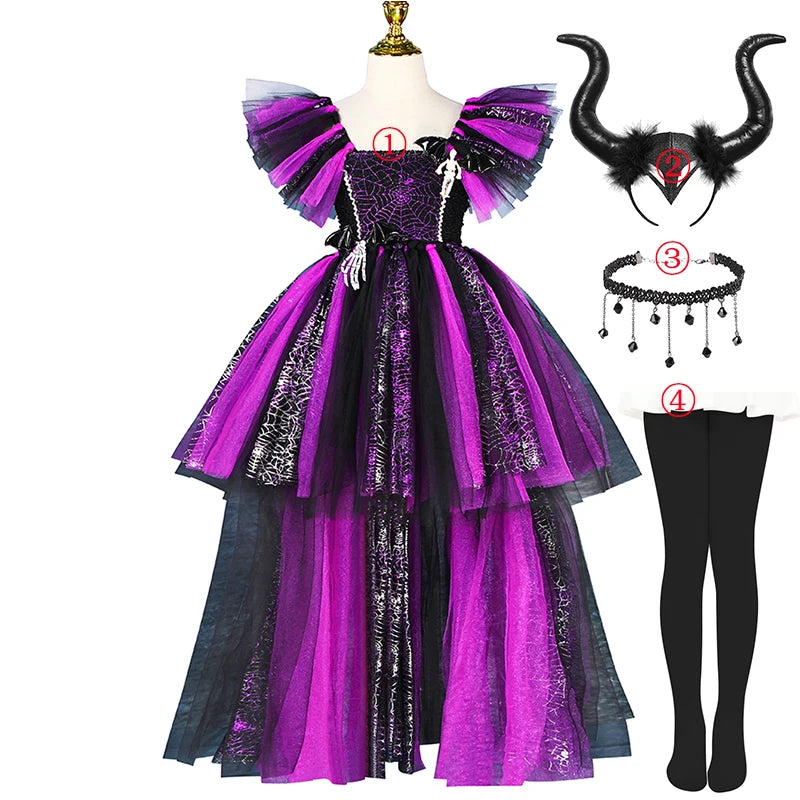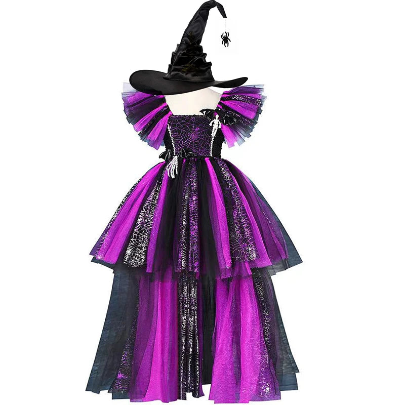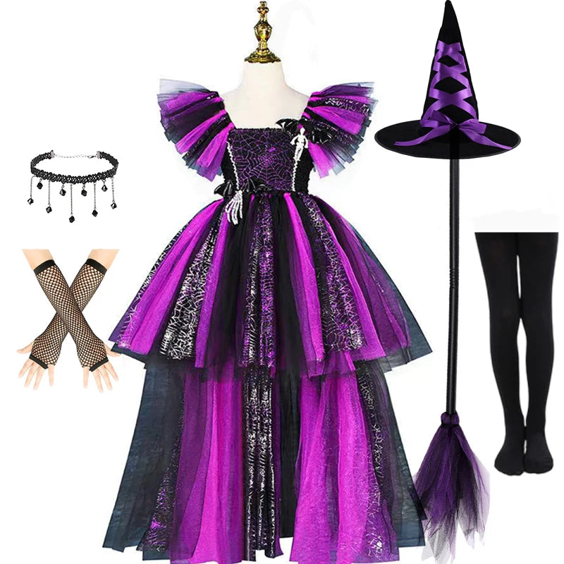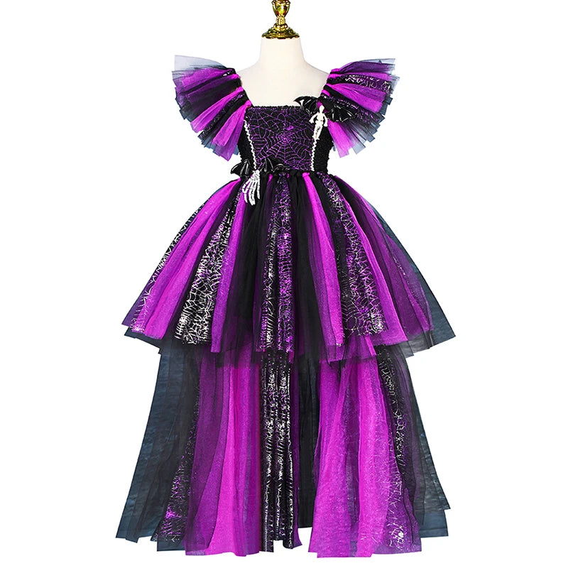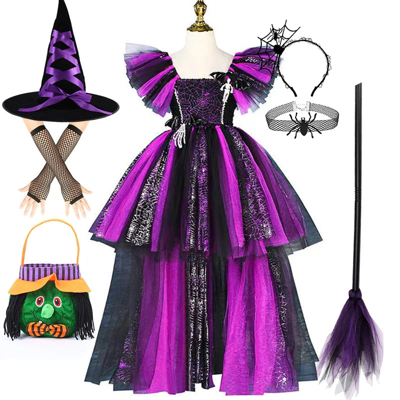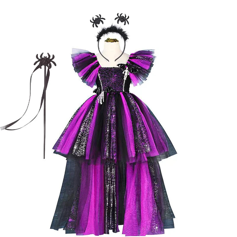 Girls Halloween Disguise Witch Costume Kid Tutu Trailing Dress Kids Carnival Cosplay Party Outfit Spider Web Design Mesh Clothes