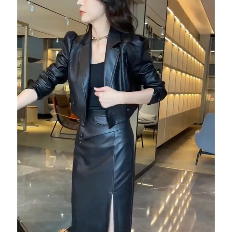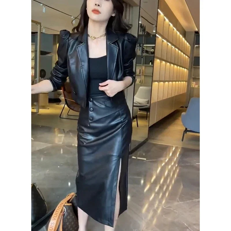 Autumn Winter Casual Fashion Long Sleeve Coat High Waist Slim Bodycon Slit Skirt Set Women Elegant Jacket Skirt Suit U547