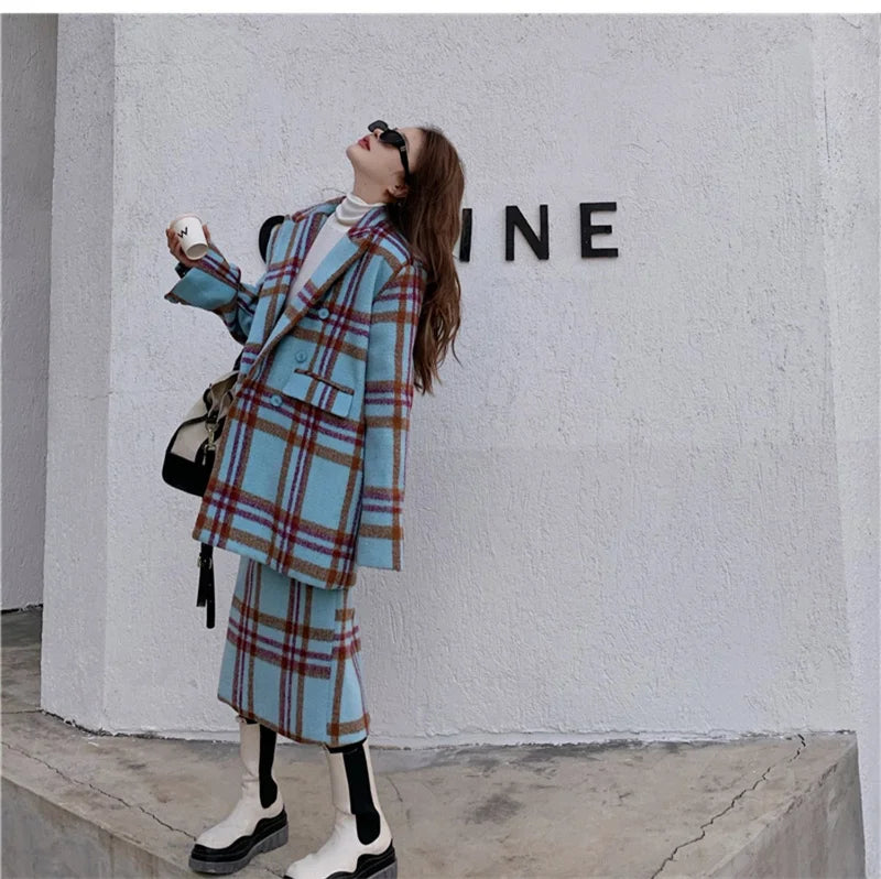 Checkered Suit Jacket for Women's Autumn/Winter 2024 Hong Kong Style Retro Small Fragrant Half Skirt Two-piece Set Trendy Trendy