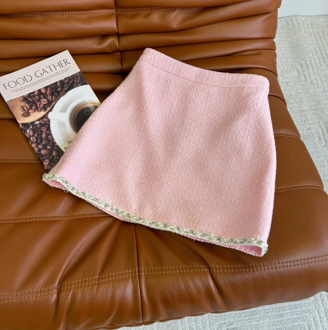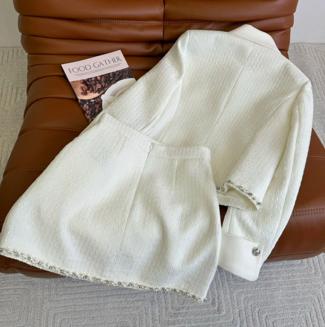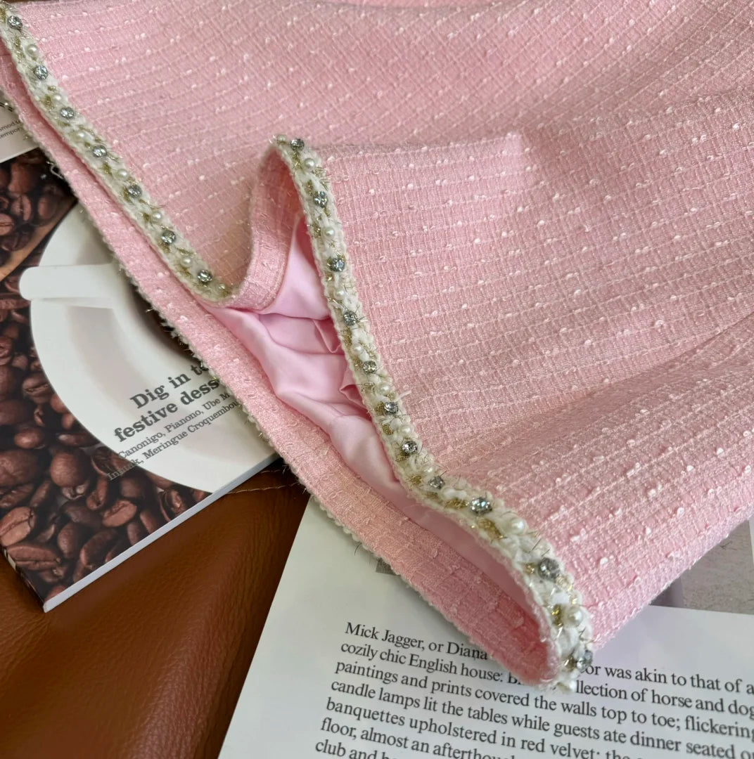 High end pearl trimmed short skirt set, featuring a short jacket paired with a high waisted skirt, exuding a luxurious  vibe